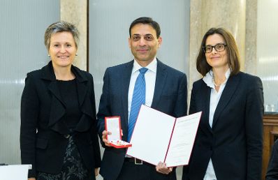 Am 14. Dezember 2017 überreichte Brigitte Winkler-Komar (r.) das Goldene Ehrenzeichen für Verdienste um die Republik Österreich an Vijay Upadhyaya (m.). Im Bild mit Laudatorin Christa Schnabl (l.).