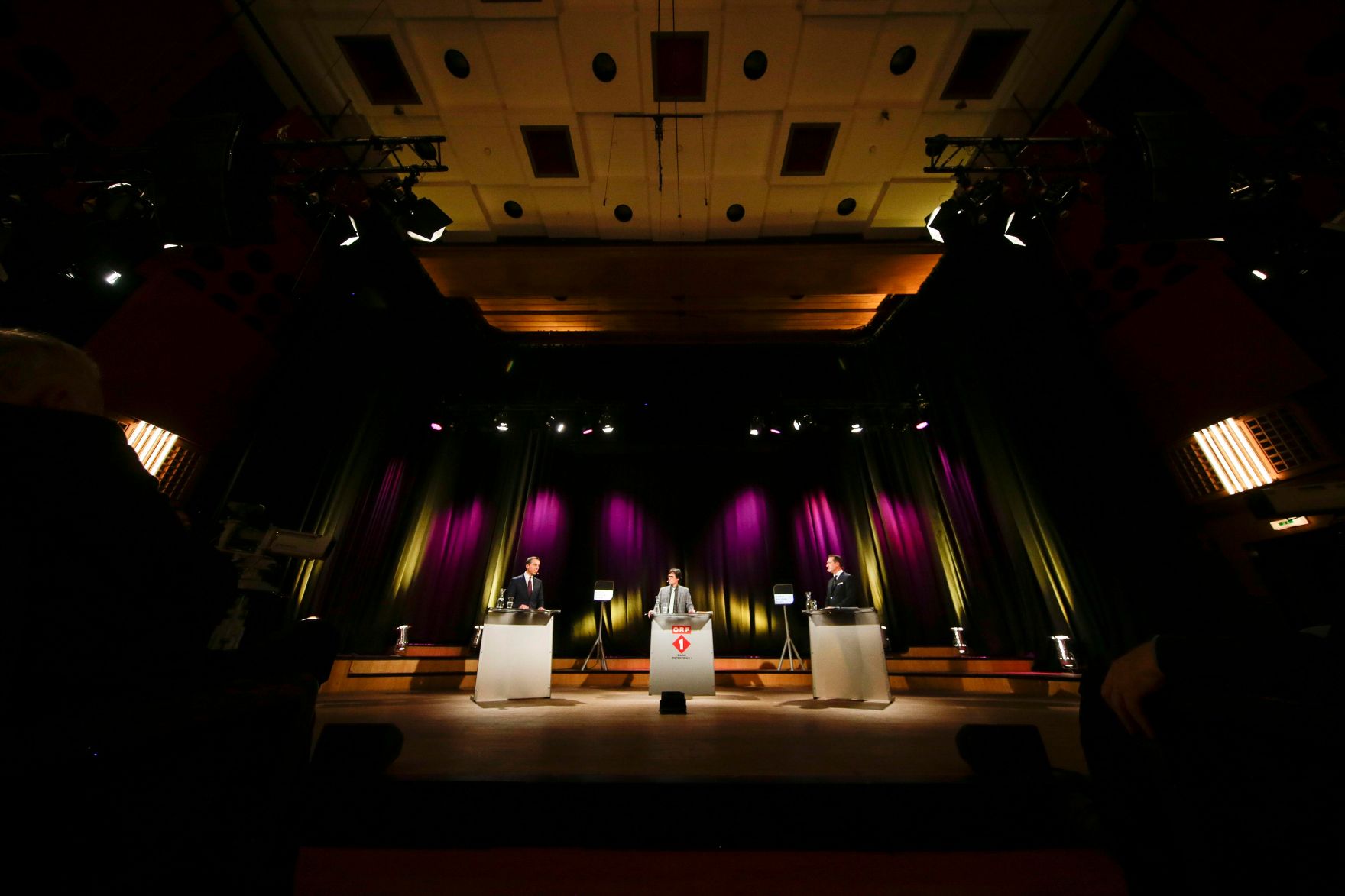 Am 23. November 2016 diskutierten Bundeskanzler Christian Kern (l.) und FPÖ Klubobmann Heinz-Christian Strache (r.) bei der Ö1- Sendung "Klartext" mit Moderator Klaus Webhofer (m.).