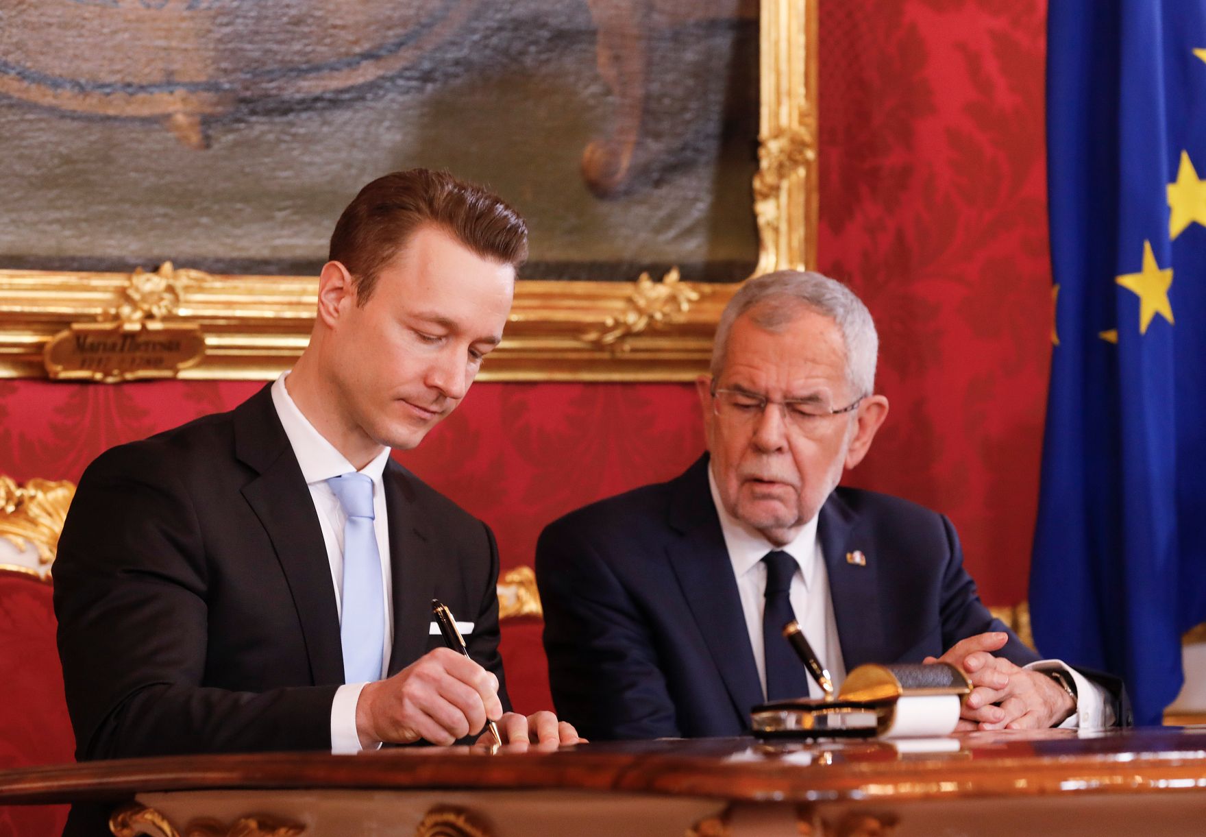 Am 7. Jänner 2020 wurde die neue Bundesregierung vom Bundespräsidenten in der Präsidentschaftskanzlei angelobt. Im Bild Bundespräsident Alexander Van der Bellen (r.) und Bundesminister Gernot Blümel (l.).