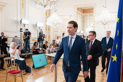 Am 9. Juli 2021 nahm Bundeskanzler Sebastian Kurz (im Bild) gemeinsam mit Bundesminister Wolfgang Mückstein, Landeshauptmann Günther Platter und dem Vizerektor der MedUni Wien, Oswald Wagner, an einer Pressekonferenz zum Auftakt der Corona Taskforce zur Vorbereitung auf den Herbst teil.