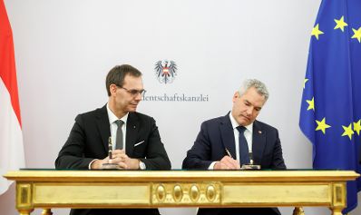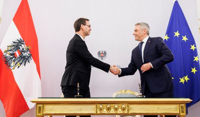 Am 11. November 2024 wurde der Landeshauptmann Markus Wallner (r.) von Bundeskanzler Karl Nehammer (l.) in Vertretung des Bundespräsidenten angelobt.