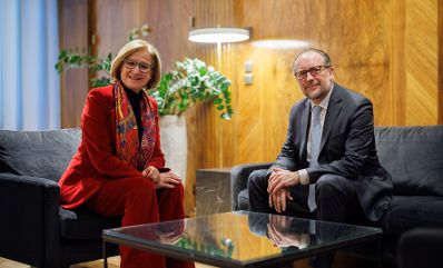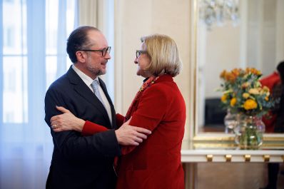Am 24. Jänner 2025 empfing Bundeskanzler Alexander Schallenberg (l.) die Landeshauptfrau von Niederösterreich Johanna Mikl-Leitner (r.) zu einem Arbeitsgespräch im Bundeskanzleramt.