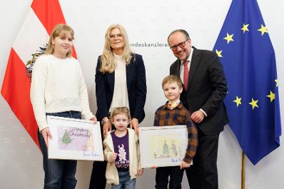 Am 13. Februar 2025 empfing Bundeskanzler Alexander Schallenberg (2.v.l.) Kinder der Ronald McDonald Kinderhilfe im Bundeskanzleramt.