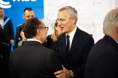 Am 14. Februar 2025 nahm Bundeskanzler Alexander Schallenberg (l.) an der Münchner Sicherheitskonferenz teil. Im Bild mit dem ehemaligen NATO-Generalsekretär Jens Stoltenberg (m.).
