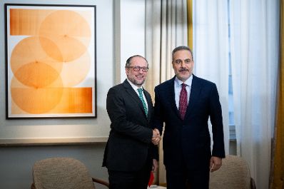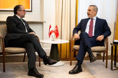 Am 14. Februar 2025 nahm Bundeskanzler Alexander Schallenberg (l.) an der Münchner Sicherheitskonferenz teil. Im Bild mit dem Türkischen Außenminister Hakan Fidan (r.).
