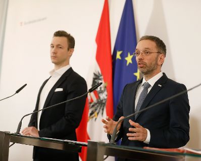 Bundesminister Gernot Blümel (l.) und Bundesminister Herbert Kickl (r.) beim Pressefoyer nach dem Ministerrat am 10. April 2019.