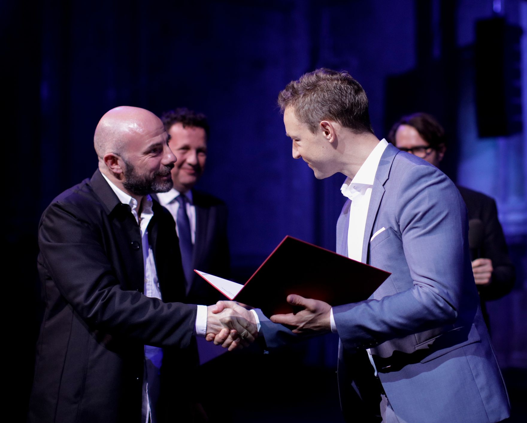 Am 5. November 2018 verlieh Bundesminister Gernot Blümel (r.) den "Österreichischen Buchpreis 2018" an Daniel Wisser (l.).