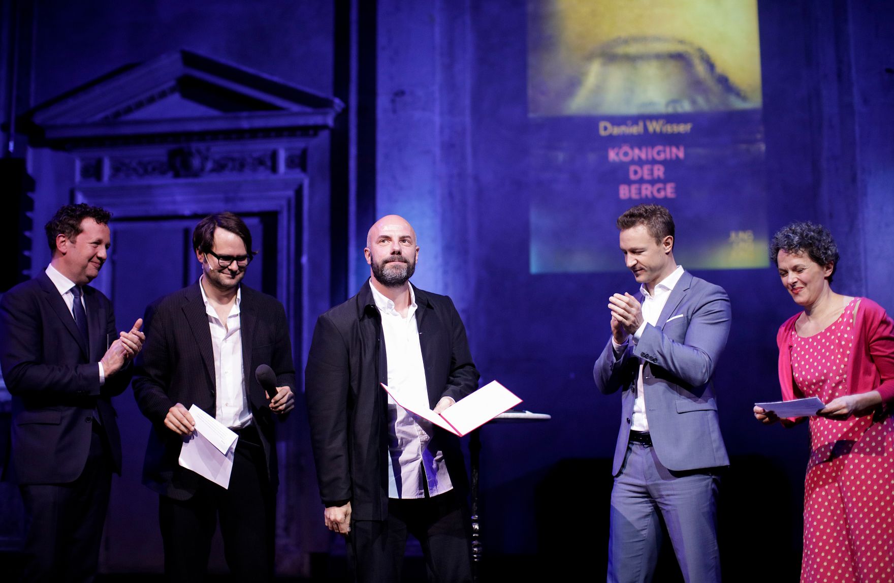 Am 5. November 2018 verlieh Bundesminister Gernot Blümel (2.v.r.) den "Österreichischen Buchpreis 2018" an Daniel Wisser (m.). Im Bild mit dem Moderator Philipp Hauß (2.v.l.) und der Moderatorin Dorothee Hartinger (r.).