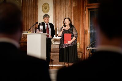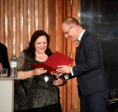 Am 6. November 2018 überreichte Bundesminister Gernot Blümel gemeinsam mit EU-Kommissar Tibor Navracsics die Europäischen Literaturpreise 2018. Im Bild der Moderator Michael Freund (l.) und die Präsidentin der professionellen Jury Liana Sakelliou (r.).