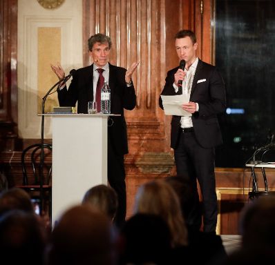Am 6. November 2018 überreichte Bundesminister Gernot Blümel gemeinsam mit EU-Kommissar Tibor Navracsics die Europäischen Literaturpreise 2018. Im Bild Moderator Michael Freund (l.) mit dem Preisträger Gast Groeber (r.).