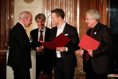 Am 6. November 2018 überreichte Bundesminister Gernot Blümel (m.r.) gemeinsam mit EU-Kommissar Tibor Navracsics die Europäischen Literaturpreise 2018. Im Bild mit dem Moderator Michael Freund (m.l.), dem Preisträger Jean Back (r.) und dem Preisträger Gast Groeber (l.).