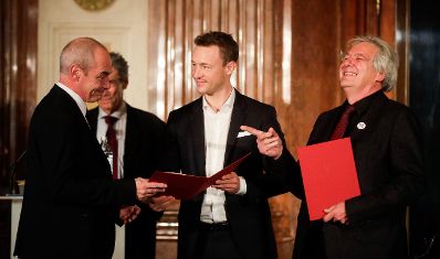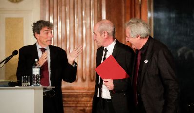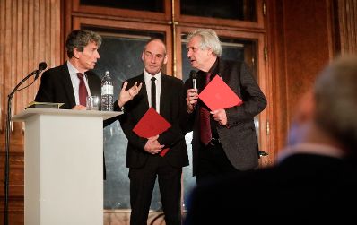Am 6. November 2018 überreichte Bundesminister Gernot Blümel gemeinsam mit EU-Kommissar Tibor Navracsics die Europäischen Literaturpreise 2018. Im Bild Moderator Michael Freund (l.), dem Preisträger Jean Back (r.) und dem Preisträger Gast Groeber (m.).
