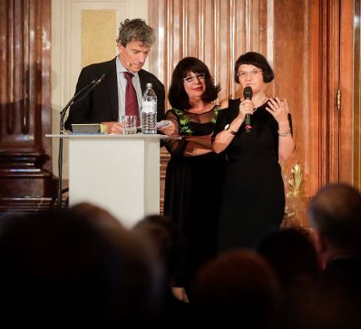 Am 6. November 2018 überreichte Bundesminister Gernot Blümel gemeinsam mit EU-Kommissar Tibor Navracsics die Europäischen Literaturpreise 2018. Im Bild der Moderator Michael Freund (l.), die Präsidentin der professionellen Jury Liana Sakelliou (m.) und die Preisträgerin Ivana Parvulescu (r.).