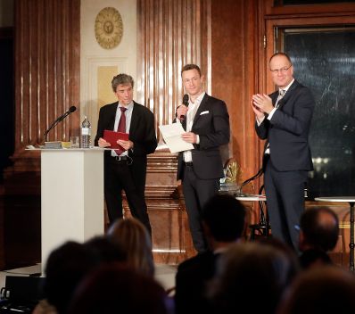 Am 6. November 2018 überreichte Bundesminister Gernot Blümel (m.) gemeinsam mit EU-Kommissar Tibor Navracsics (r.) die Europäischen Literaturpreise 2018. Im Bild mit dem Moderator Michael Freund (l.).