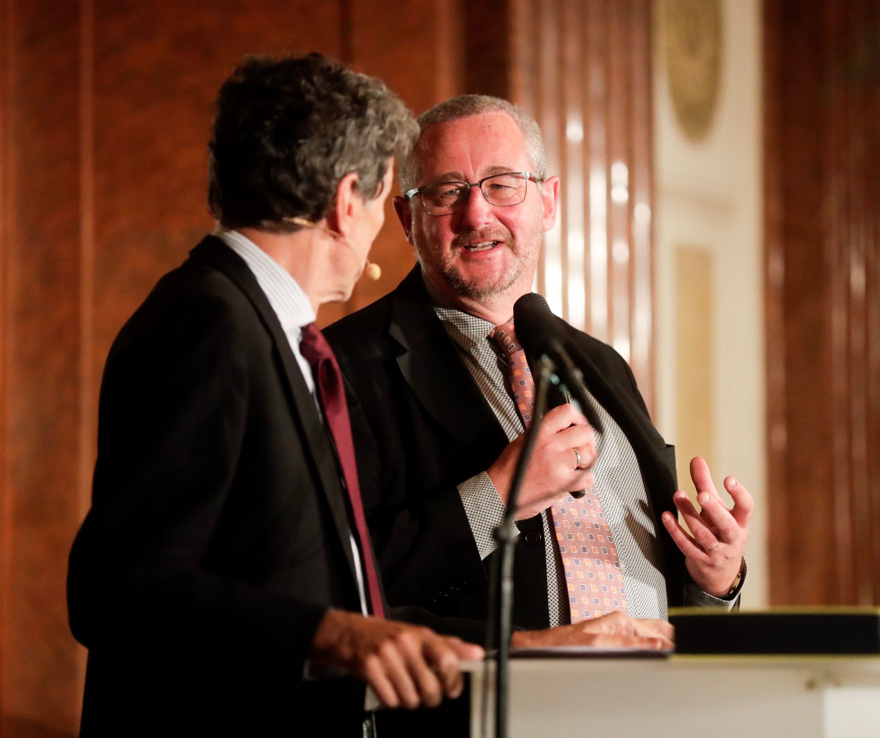 Am 6. November 2018 überreichte Bundesminister Gernot Blümel gemeinsam mit EU-Kommissar Tibor Navracsics die Europäischen Literaturpreise 2018. Im Bild Moderator Michael Freund (l.) mit dem Präsident des Verlegerverbandes Rudy Vanschoonbeek (r.).