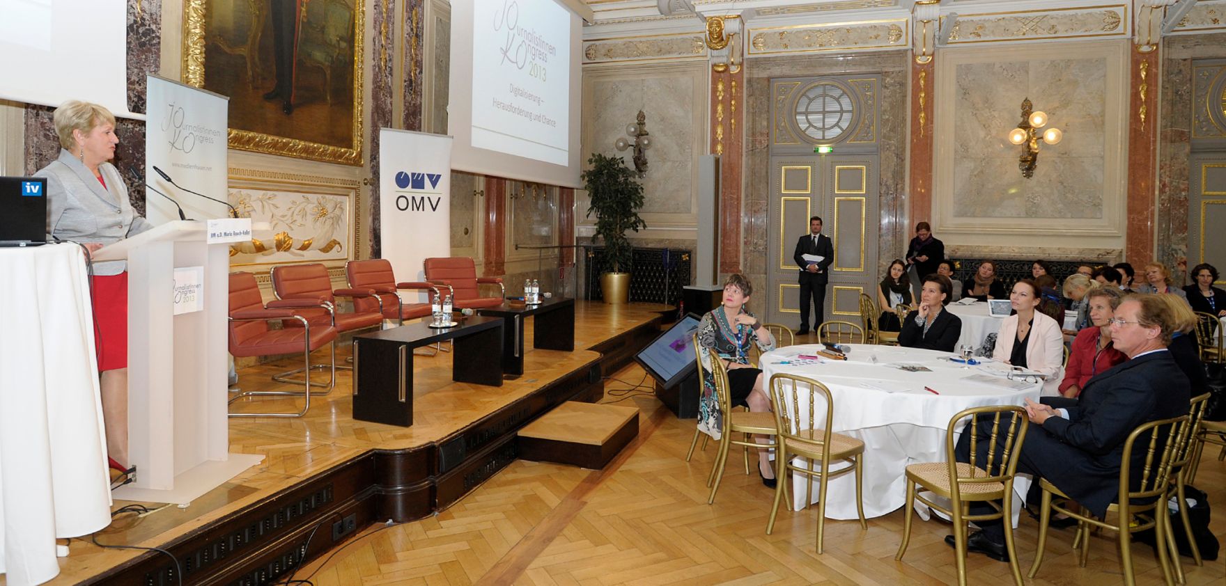 Am 5. November 2013 sprach Frauenministerin Gabriele Heinisch-Hosek die Begrüßungsworte beim Journalistinnenkongress 2013 „Digitalisierung – Herausforderung oder Chance?“. Im Bild während der Begrüßungsworte von Maria Rauch-Kallat.