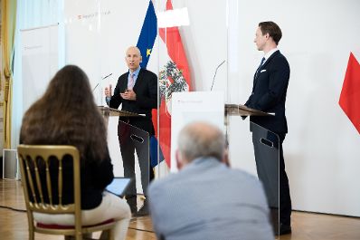 Am 8. Juni 2021 fand eine Pressekonferenz zur aktuellen Lage am Arbeitsmarkt statt. Im Bild Bundesminister Martin Kocher (l.) und Bundesminister Gernot Blümel (r.).