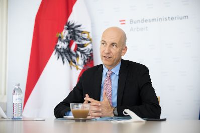 Am 8. Juni 2021 nahm Bundesminister Martin Kocher (im Bild) an einer Videokonferenz mit Schülerinnen und Schüler der Bundeshandelsakademie Bad Ischl teil.