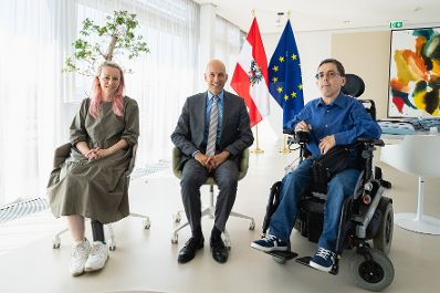 Am 29. Juli 2021 traf Bundesminister Martin Kocher (m.) Christine Steger (l.) und Martin Ladstätter (r.) zu einem Arbeitsgespräch.