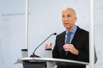 Am 1. Februar 2022 fand eine Pressekonferenz zur aktuellen Lage am Arbeitsmarkt mit Bundesminister Martin Kocher (im Bild), Bundesministerin Susanne Raab und der Geschäftsführerin des AMS-Wien, Petra Draxl statt.