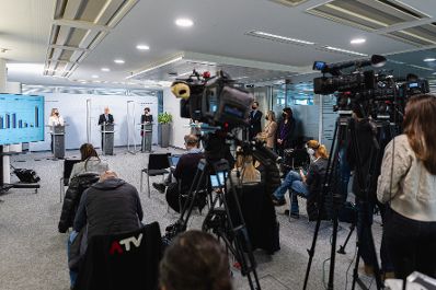 Am 1. Februar 2022 fand eine Pressekonferenz zur aktuellen Lage am Arbeitsmarkt mit Bundesminister Martin Kocher (m.), Bundesministerin Susanne Raab (l.) und der Geschäftsführerin des AMS-Wien, Petra Draxl (r.) statt.