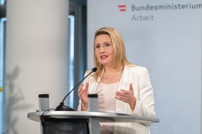 Am 1. Februar 2022 fand eine Pressekonferenz zur aktuellen Lage am Arbeitsmarkt mit Bundesminister Martin Kocher, Bundesministerin Susanne Raab (im Bild) und der Geschäftsführerin des AMS-Wien, Petra Draxl statt.