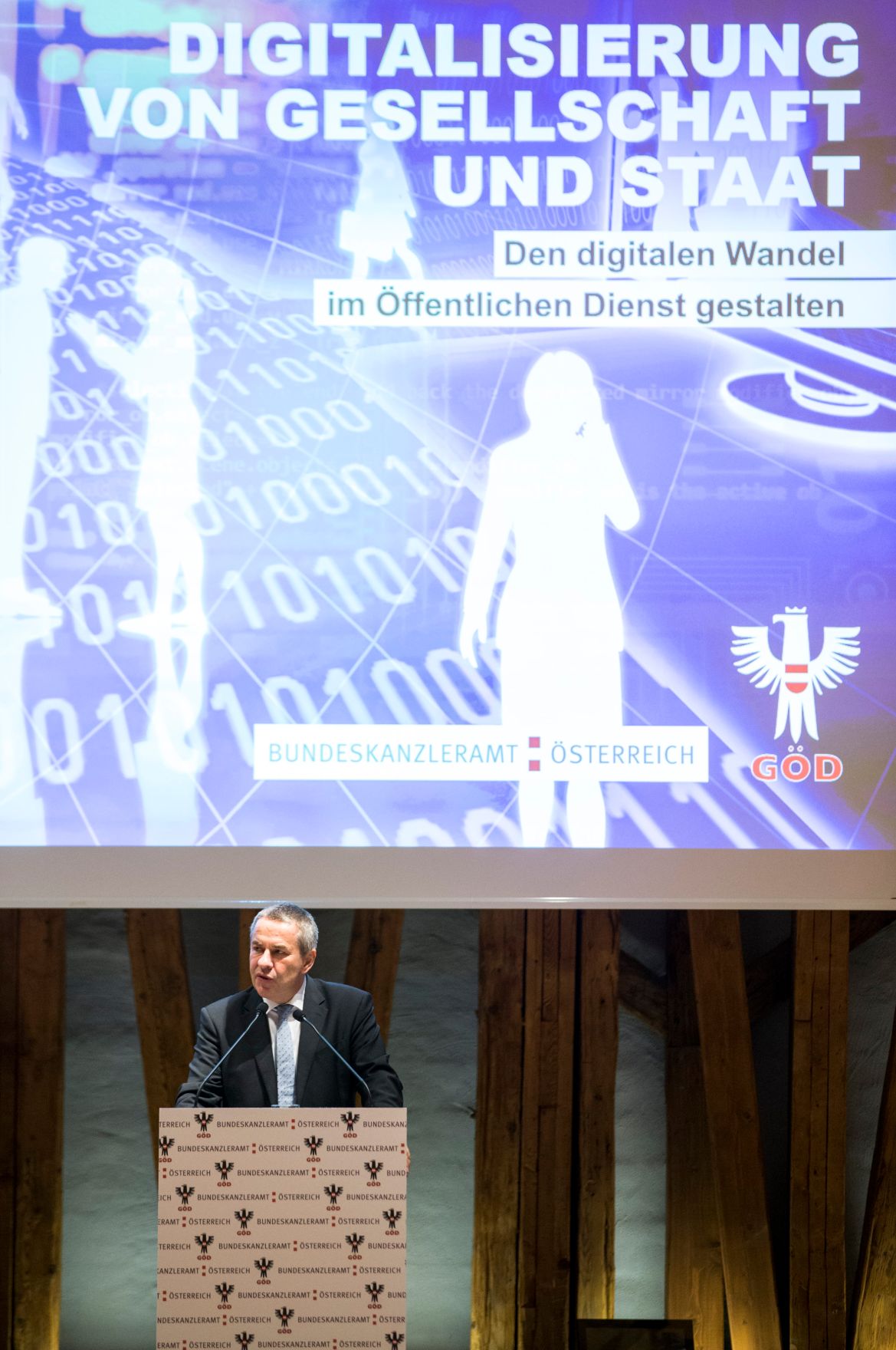 Am 4. Juli 2017 nahm Staatssekretärin Muna Duzdar an der Veranstaltung "Digitalisierung von Gesellschaft und Staat – die Transformation im öffentlichen Dienst gestalten" teil. Im Bild der GÖD Vorsitzende Norbert Schnedl.