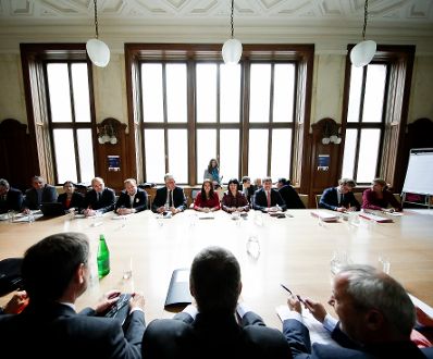 Am 26. September 2017 fand der Auftakt der Gehaltsverhandlungen Öffentlicher Dienst in der Hohenstaufengasse statt. Im Bild Staatssekretärin Muna Duzdar (m.) mit Finanzminister Hans Jörg Schelling (l.) und Sektionschefin Angelika Flatz (r.).