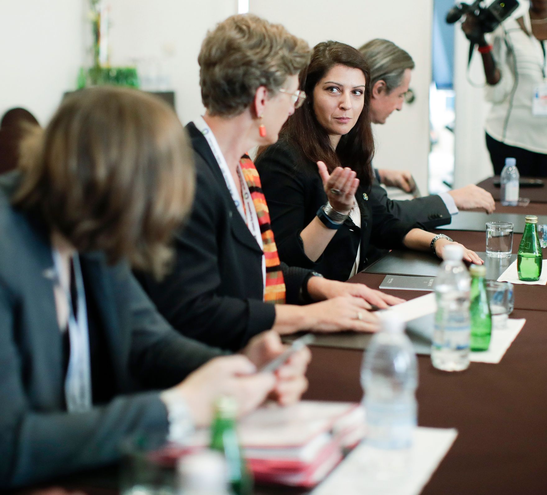 Am 29. November 2017 nahm Staatssekretärin Muna Duzdar (2.v.r.) am EU-Afrika Gipfel teil. Im Bild beim Gespräch mit dem Premierminister von Uganda Ruhakana Rugunda.