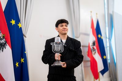 Am 19. Mai 2025 empfing Bundeskanzler Christian Stocker gemeinsam mit Vizekanzler Andreas Babler, Bundesministerin Beate Meinl-Reisinger und Staatssekretärin Elisabeth Zehetner den Eurovision Song Contest-Sieger JJ (im Bild) im Bundeskanzleramt.