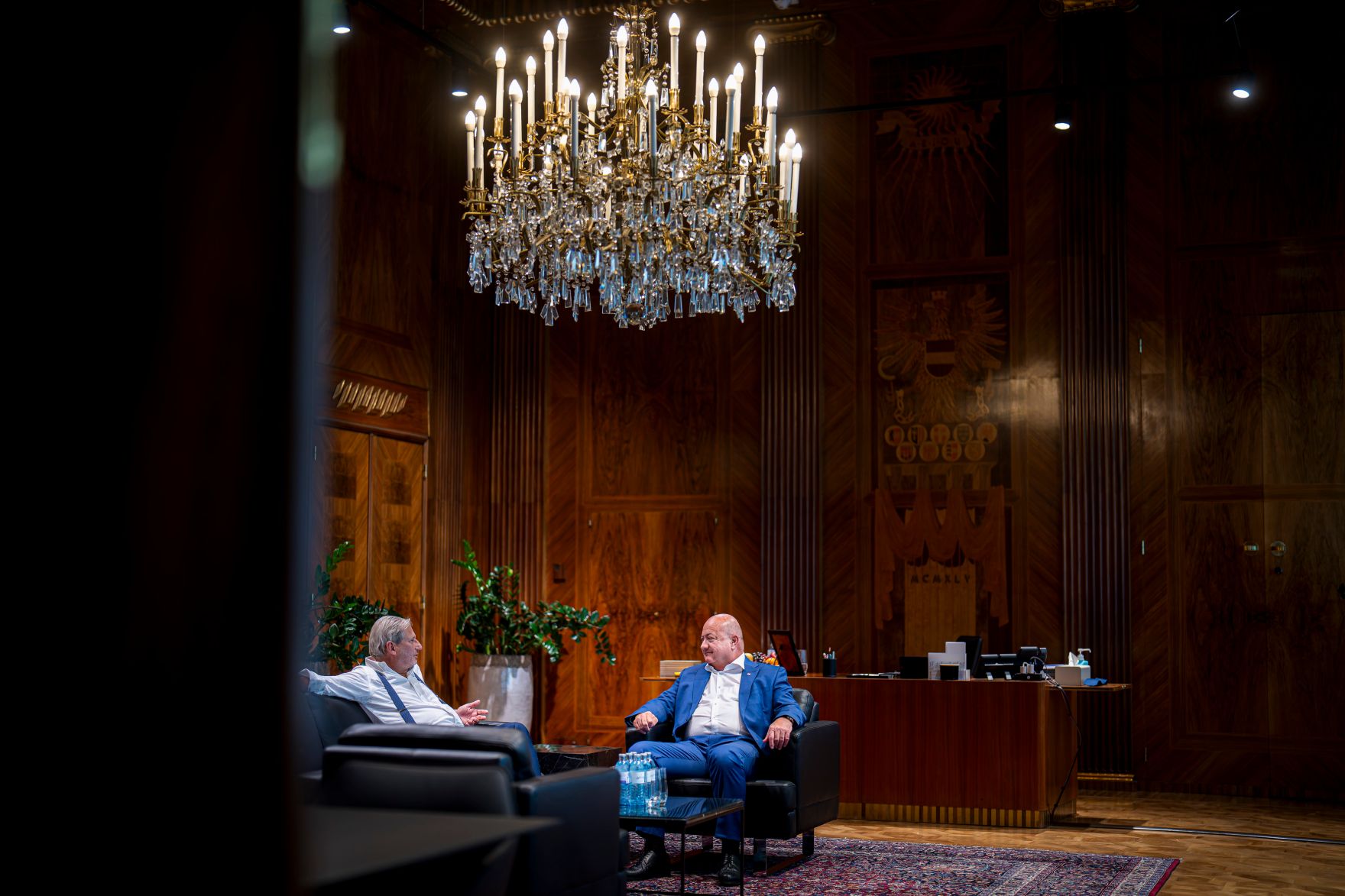 Am 3. Juli 2025 empfing Bundeskanzler Christian Stocker (r.) Bundesminister a.D. Johannes Hahn (l.) zu einem Arbeitsgespräch.