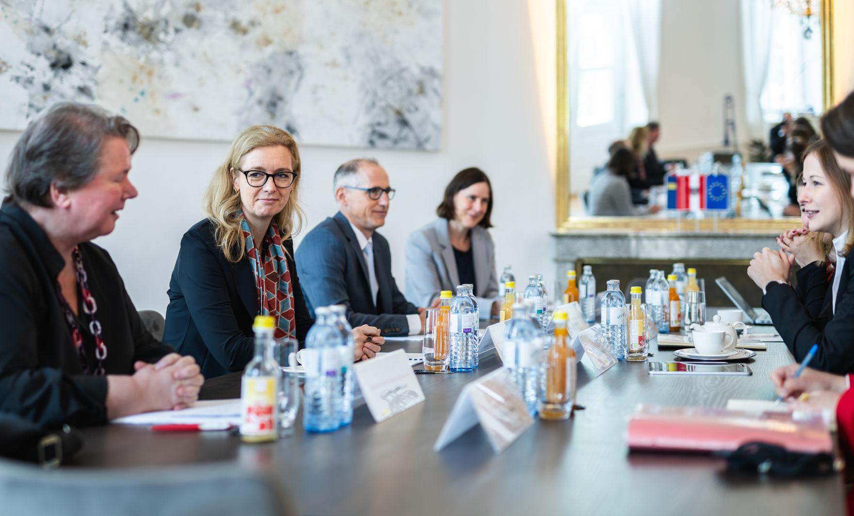 Am 23. Mai 2025 empfing Bundesministerin Claudia Plakolm (r.) die stellvertretende Regierungschef des Fürstentums Liechtenstein Sabine Monauni (2.v.l.) zu einem Arbeitsgespräch im Bundeskanzleramt.