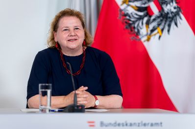 Am 2. Juli 2025 nahmen Bundesministerin Claudia Plakolm (im Bild), Bundesminister Christoph Wiederkehr und Bundesministerin Korinna Schumann am Pressefoyer nach dem Ministerrat teil.