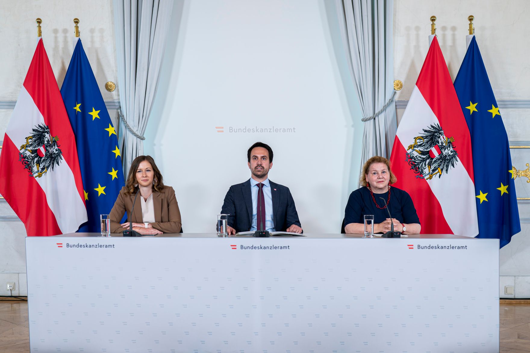 Am 2. Juli 2025 nahmen (v.l.n.r.) Bundesministerin Claudia Plakolm, Bundesminister Christoph Wiederkehr und Bundesministerin Korinna Schumann am Pressefoyer nach dem Ministerrat teil.