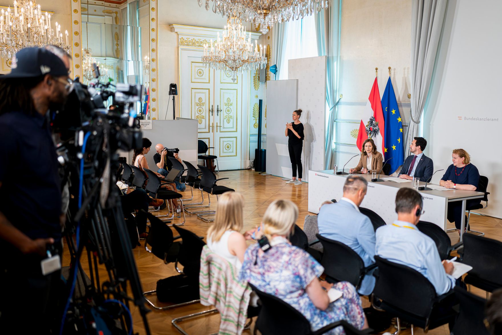 Am 2. Juli 2025 nahmen (v.l.n.r.) Bundesministerin Claudia Plakolm, Bundesminister Christoph Wiederkehr und Bundesministerin Korinna Schumann am Pressefoyer nach dem Ministerrat teil.