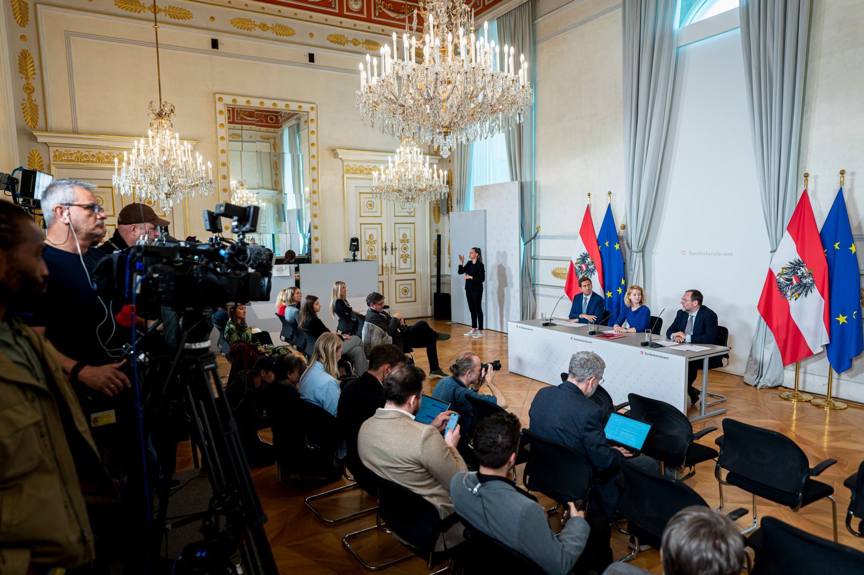 Am 21. Mai 2025 nahmen Bundesministerin Eva-Maria Holzleitner (m.), Staatssekretär Alexander Pröll (l.) und Staatssekretär Josef Schellhorn (r.) am Pressefoyer nach dem Ministerrat teil.