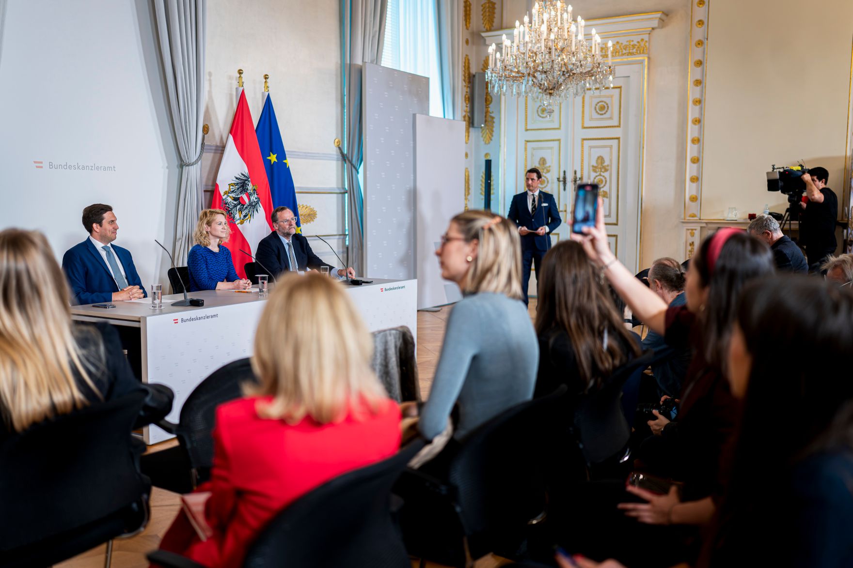 Am 21. Mai 2025 nahmen Bundesministerin Eva-Maria Holzleitner (m.), Staatssekretär Alexander Pröll (l.) und Staatssekretär Josef Schellhorn (r.) am Pressefoyer nach dem Ministerrat teil.