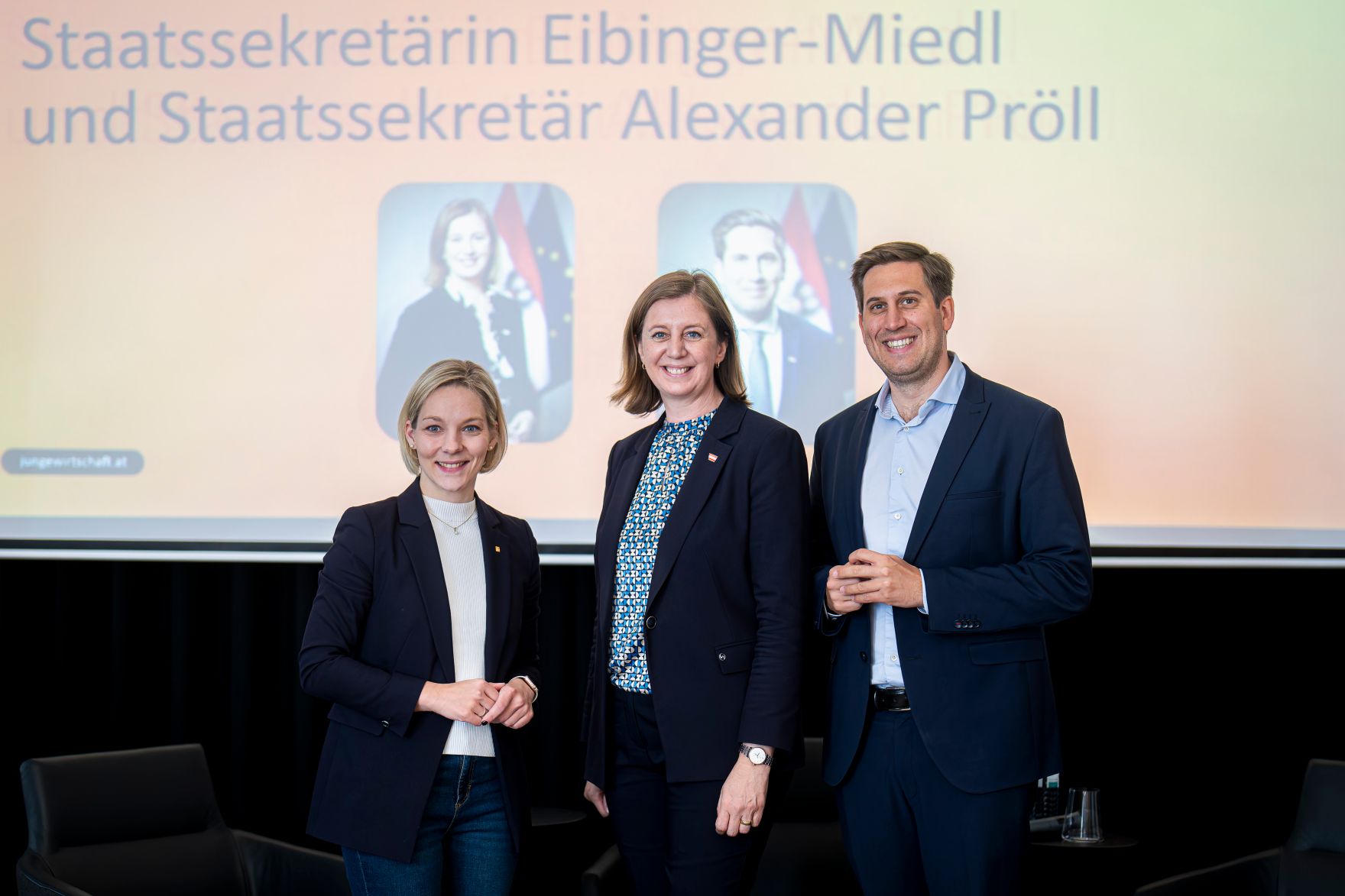 Am 23. Mai 2025 nahm Staatssekretär Alexander Pröll (r.) am "JW Leaders Forum 2025" der Jungen Wirtschaft in Wien teil. Im Bild mit Staatssekretärin Barbara Eibinger-Miedl (m.).