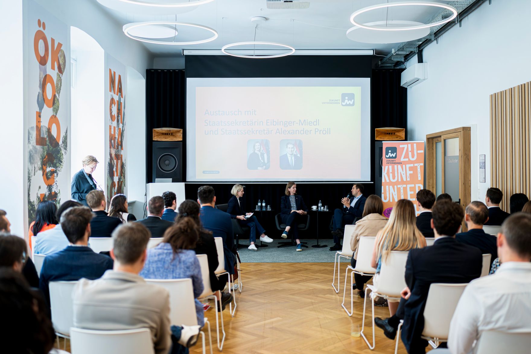 Am 23. Mai 2025 nahm Staatssekretär Alexander Pröll (m.r.) am "JW Leaders Forum 2025" der Jungen Wirtschaft in Wien teil. Im Bild mit Staatssekretärin Barbara Eibinger-Miedl (m.).
