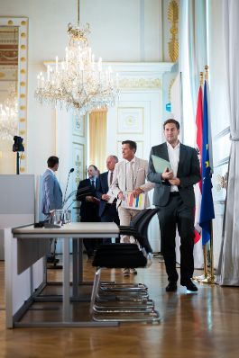 Am 25. Juni 2025 nahm Staatssekretär Alexander Pröll (r.) gemeinsam mit Bundesminister Peter Hanke (2.v.r.), Bundesminister Gerhard Karner (2.v.l.) und Staatssekretär Sepp Schellhorn (l.) am Pressefoyer nach dem Ministerrat teil.