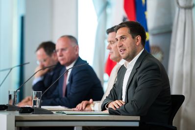 Am 25. Juni 2025 nahm Staatssekretär Alexander Pröll gemeinsam mit Bundesminister Peter Hanke, Bundesminister Gerhard Karner und Staatssekretär Sepp Schellhorn (im Bild) am Pressefoyer nach dem Ministerrat teil.