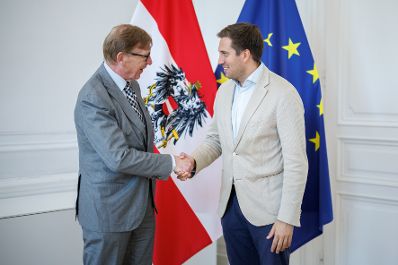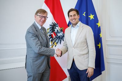 Am 3. Juli 2025 empfing Staatssekretär Alexander Pröll (r.) den Präsidenten des Verwaltungsgerichtshofes Rudolf Thienel (l.) zu einem Arbeitsgespräch.