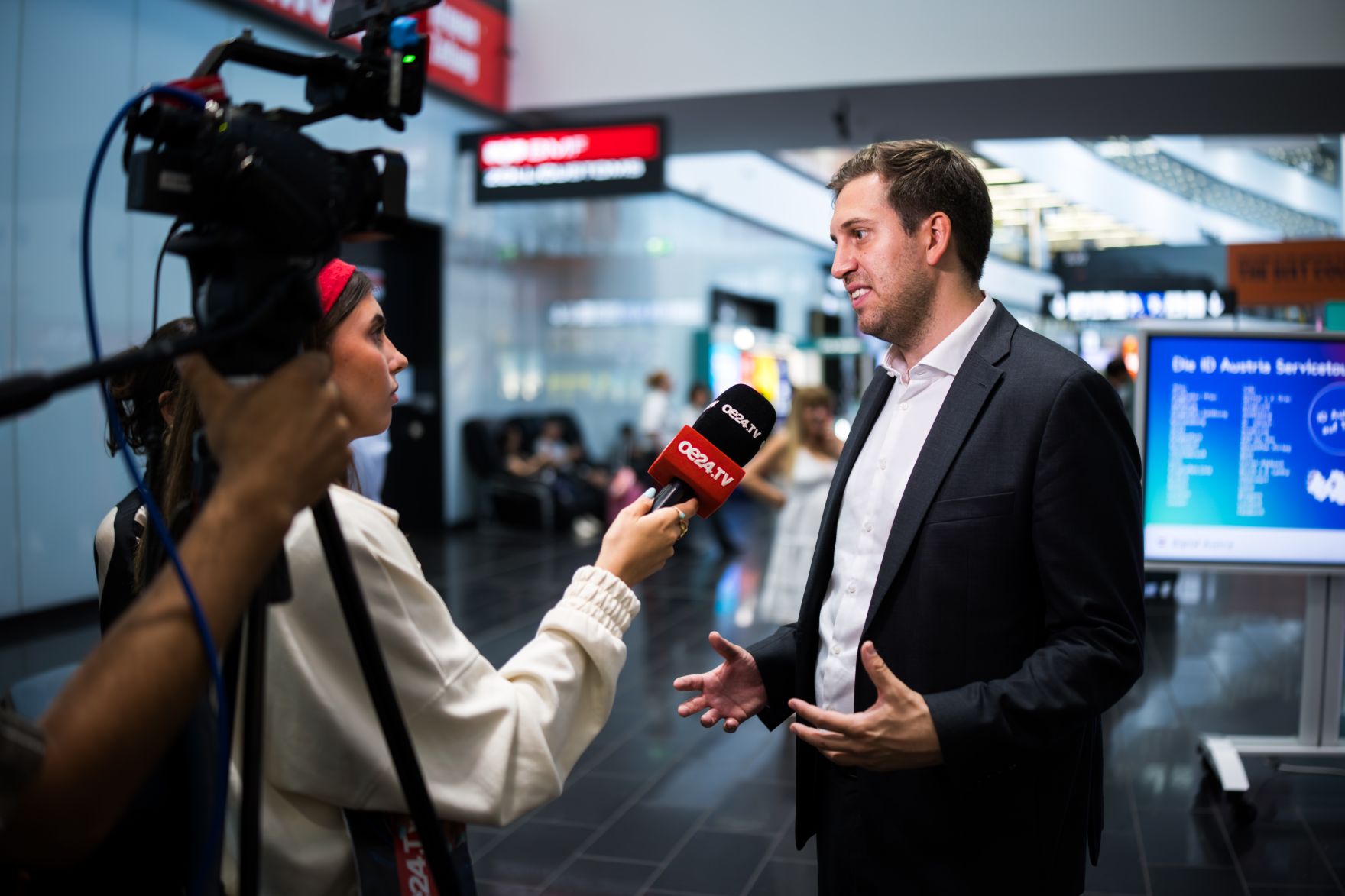 Am 4. Juli 2025 besuchte Staatssekretär Alexander Pröll (r.) anlässlich des Starts der ID-Austria Servicetour 2025 den Flughafen Wien-Schwechat.