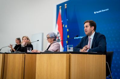 Am 9. Juli 2025 nahmen Bundesministerin Beate Meinl-Reisinger, Bundesministerin Anna Sporrer und Staatssekretär Alexander Pröll (im Bild) am Pressefoyer nach dem Ministerrat teil.
