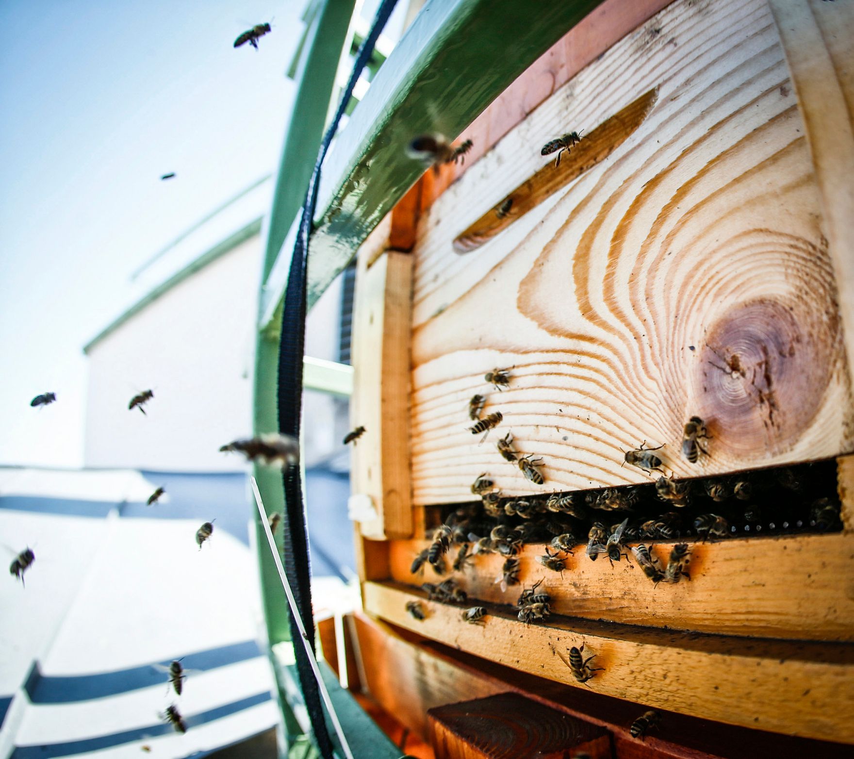 Bienen bei einem Bienenstock auf dem Dach des Bundeskanzleramtes.